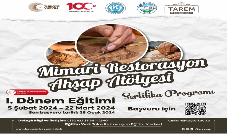 Merkezin mimari restorasyon ahşap, demir ve taş atölyesi birinci dönem sertifikalı eğitim programlarına kayıtlar 28 Ocak’ta sona erecek. 5 Şubat-22 Mart arasındaki ilk dönem eğitim programına kayıt yaptırmak isteyenler www.kaysem.kayseri.edu.tr adresinden veya 0352 432 3838-42340 numaralı telefondan detaylı bilgi alabilecek.