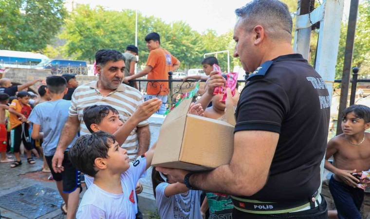 Diyarbakır’da hava sıcaklığının yüksek seyretmesiyle birlikte Diyarbakır Trafik Denetleme Şube Müdürlüğü ekipleri merkez Sur ilçesinde bulunan Anzele suyunda serinlemek isteyen çocuklara dondurma ikramında bulunarak, bir nebze de olsa içlerini ferahlattı.