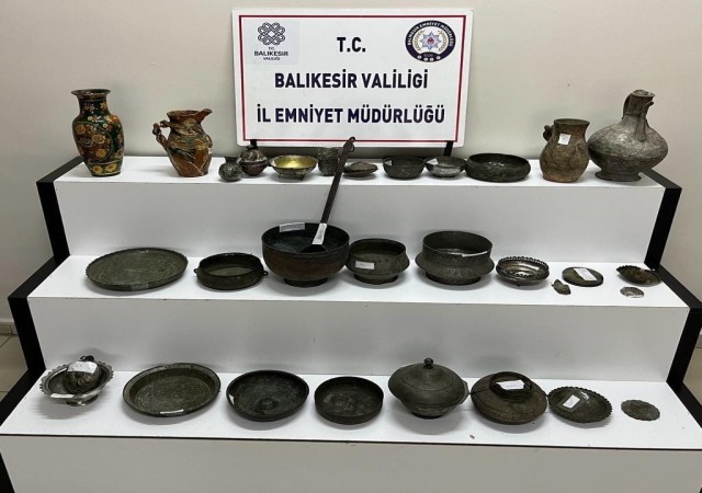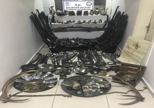Balıkesir İl Emniyet Müdürlüğü Balıkesir Kaçakçılık ve Organize Suçlarla Mücadele Şube Müdürlüğü (KOM) Edremit İlçe Emniyet Müdürlüğü Kaçakçılık ve Organize Suçlarla Mücadele Büro Amirliği ekipleri, istihbarat bilgileri çerçevesinde bir kişinin ikamet ve eklentilerine operasyon düzenledi. Yapılan aramada ekipler, tarihi eser niteliğinde olduğu değerlendirilen; 103 adet tüfek, 13 adet tabanca, 10 adet mavzer tabir edilen yarı otomatik tüfek, 1 adet yivli tüfek, 60 adet kılıç, kama ve süngü 67 adet obje, 2 adet dürbün, 21 adet kitap, 89 adet para veya değerli kağıt, 1 adet pusula, bin 402 adet sikke 1 çift geyik boynuzu, 1 adet berat ya da ferman 38 adet 6.5x54 ibareli mavzer mermisi, 19 adet mavzer mermisi, 1 adet ibaresiz mermi 12 adet ibaresiz çekirdek, 22 adet 22 kalibre mermi, 24 adet köstekli tabir edilen saat, 2 adet metal kemer ve bunlara ait 4 adet parça, 5 adet üzerinde farklı adetlerde ve ebatlarda sikkeler ve mühür takılı ip ve zincir kolye, 48 adet farklı boyutlarda Arapça ve Osmanlıca yazılı mühür, 10 adet kolye, kemer, bileklik, tabak, maşa olan objeler, 1 kutu içerisinde Arapça ve Osmanlıca yazılı mühür ve broş, 1 adet TC Ankara Ulus İlkokulu Müdürlüğü ibareli mühür, 4 adet kovan, 1 tele takılı 5 adet sikke, 4 adet figür ve 1 adet renkli boncuk, 2 adet tepsi ele geçirildi. Yakalanan şüpheli kişinin işlemleri sürdüğü öğrenildi.