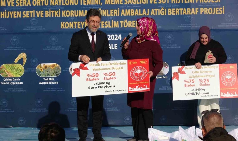 “2024 yılında da Türkiye’nin dört bir tarafında bu projeyle birlikte belli oranlarda yüzde 50 ile yüzde 75 arasında hibe desteğiyle bu tohumları dağıtmaya devam edeceğiz. Çünkü bizler biliyoruz ki ambar anahtarı kimdeyse güç ondadır. Biz bu şuurla çalışıyoruz, bu şuurla çiftçimizi, üreticimizi desteklemeye devam ediyoruz. 2024’te de Çanakkale’de 946 çiftçimiz bu projeden faydalanmış olacak. 31 bin dekarlık alanda bu proje kapsamında ekilmiş olacak. Projesi kapsamında tohumları alacak olan üretici kardeşlerimize hem sera naylonuyla ile beraber üretimlerini biraz daha iyi şartlarda yapacak olan üreticilerimize, yine hayvansal üretimde özellikle süt hijyeni ile ilgili konuda kendilerine vereceğimiz aparatlardan yararlanacak olan üreticilerimize hayırlı bereketli olsun diyorum. Son olarak da değerli Valimizin daha önce başlatmış olduğu zirai ilaçlar kullanıldıktan sonra çevreye atıldığında oluşacak olan problemlerin engellenmesi adına aslında çok basit bir dokunuş ama ne kadar etkili olduğunu gördük. Yine şu görmüş olduğunuz konteynırlar çok basitmiş gibi görünebilir. Ancak bu konteynırların içerisine toplanmış olan zirai ilaç atık ambalajları aslında ne kadar büyük bir çevresel problemi engelliyor. Bunu da çıkaran sonuçlardan bizler görmüş oluyoruz. Türkiye’miz çok üretsin. 2022 yılı sonunda 129 milyon ton idi. 2023 sonunda 137 milyon ton, 31 milyar dolar 2023 sonu itibari ile tarımsal ürün, yani gıda ürünü ihraç etti bu ülke. Daha çok üreteceğiz. Kendi vatandaşımızın, ülkemize gelen turistlerin ve daha fazla ihracat yapacak ürünü üreteceğiz inşallah. Hem en kalitelisinden, hem en verimlisinden ve sürdürülebilir bir şekilde.”
