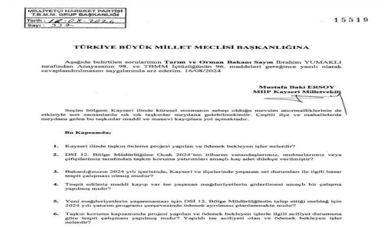 Milliyetçi Hareket Partisi (MHP) Kayseri Milletvekili Baki Ersoy’un Tarım ve Orman Bakanlığı’na 27 Ağustos tarihinde gönderdiği önergesine bakanlıktan cevap geldi.