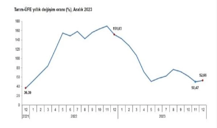 TÜİK, Aralık 2023 dönemine ilişkin Tarım-ÜFE verilerini açıkladı. Buna göre; aralık ayında bir önceki aya göre yüzde 6,34 artış, bir önceki yılın aralık ayına göre yüzde 52,66 artış ve 12 aylık ortalamalara göre yüzde 72,04 artış gerçekleşti. Sektörlerde bir önceki aya göre, ormancılık ürünleri ve ilgili hizmetlerde yüzde 1,86 artış, balık ve diğer balıkçılık ürünlerinde yüzde 2,62 artış ve tarım ve avcılık ürünleri ve ilgili hizmetlerde yüzde 6,55 artış gerçekleşti. Ana gruplarda bir önceki aya göre; çok yıllık bitkisel ürünlerde yüzde 1,98 azalış, canlı hayvanlar ve hayvansal ürünlerde yüzde 4,96 artış ve tek yıllık bitkisel ürünlerde yüzde 11,81 artış gerçekleşti.