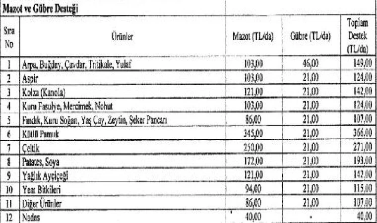 Dekar başına; arpa, buğday, çavdar, tritikale ve yulaf üretimine 103 TL mazot, 46 TL gübre, aspir üreticilerine 103 TL mazot, 21 TL gübre, kolza (kanola) üreticilerine 121 TL mazot, 21 TL gübre, fındık, kuru soğan, yaş çay, zeytin, şeker pancarı üretimine 86 TL mazot, 21 TL gübre, kütlü pamuk üreticilerine 345 TL mazot, 21 TL gübre, çeltik üretimine 250 TL mazot, 21 TL gübre, patates, soya üreticilerine 172 TL mazot, 21 TL gübre, yağlık ayçiçeği üretimine 121 TL mazot, 21 TL gübre, yem bitkileri üretimine 94 TL mazot, 21 TL gübre, diğer ürünlerde 86 TL mazot, 21 TL gübre destek ödemesi yapılacak. Mazot ve gübre desteğinden yararlanmak isteyen çiftçiler, taleplerini 29 Aralık'a kadar yazılı olarak bildirecek. (DHA)