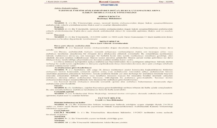 Resmi Gazete'de yayımlanan yönetmelik kapsamında; tarımsal üretim sözleşmesinden doğan uyuşmazlıklar hakkında açılacak davalarda, dava açılmadan önce arabulucuya başvurulması dava şartı olacak. Bu uyuşmazlıklarda sözleşmeli üretim konusunda uzmanlık eğitimi almış olan arabulucular; bu eğitimi alan arabulucuların bulunmaması durumunda diğer arabulucular görevlendirilecek.