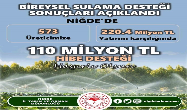 Niğde Tarım ve Orman İl Müdürü Asım Baş, yaptığı açıklamada Bireysel Sulama Destekleme Projesi’nde Türkiye genelinde ilk sıralarda yer aldıklarını belirterek, 110 milyon TL hibe almaya hak kazanıldığını kaydetti. Baş, "Tarım ve Orman Bakanlığı’nın talimatları doğrultusunda suyu merkeze alan bir politika çerçevesinde bütün iş ve işlemlerimiz yürütülecek. Su bizim hayatımızın olmazsa olmazı, tarımsal üretimin de en vazgeçilmez ve en temel unsuru. Bu sebeple tarımsal sulama, basınçlı sulama sistemlerinde il olarak bu yıl yeni bir rekora imza attık. Türkiye’de Bireysel Sulama Projesi çerçevesinde ilk sırada yer alıyoruz. Niğde olarak 573 projemiz Tarım ve Orman Bakanlığı tarafından onaylandı. Projelerimize 110 milyon TL hibe almaya hak kazandık. 573 projemizin toplam bedeli ise 220 milyon TL" dedi.