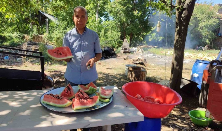 Tadı, rengi ve aromasıyla çok farklı olan Beyağaç meşhur karpuzundan pekmez üretmeye karar verdiğini anlatan Mehmet Özdemir, “İşçilere para verip daha çok zarar etmemek için her sabah arabamın arkasına bağladım römorka karpuz toplayıp geliyorum. Karpuzları tek tek yıkadıktan sonra kabuklarını soyuyorum. Karpuzları ezerek karpuz suyu elde ediyorum. Çekirdeklerinden ayrılmış karpuz suyunu bakır kazanlarda, odun ateşinde yaklaşık sekiz saat kaynattıktan sonra karpuz pekmezi elde ediyorum. Karpuzdan pekmez yapmak için daha öncede çalışmalar yapıldı ancak başarılı olunamadı. Ben pekmez yapmayı çok iyi bildiğim için karpuz pekmezini üretmeyi başardım. Yaklaşık 20 kilogram karpuz suyundan 1 kilograma yakın karpuz pekmezi elde ediyorum. Karpuz pekmezinin tadı aroması, üzüm pekmezine göre çok farklı ve bana göre daha güzel. Kışın insanların sağlıklarını koruması, daha çok enerjik olması için mutlaka tamamen organik, ürettiğim karpuz pekmezinin tadına bakmaya davet ediyorum” şeklinde konuştu.