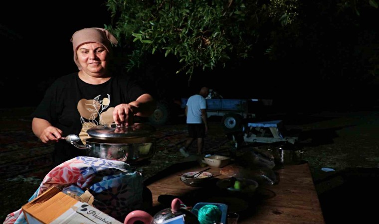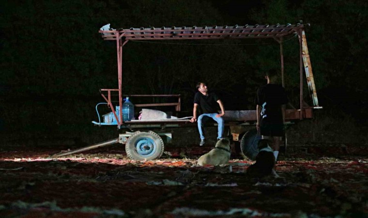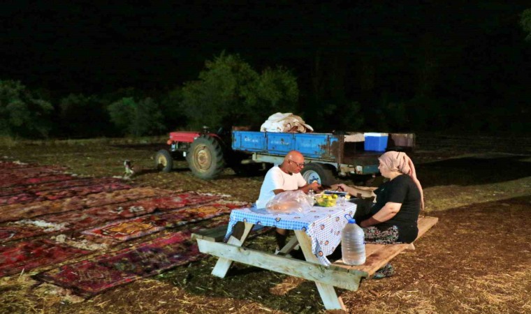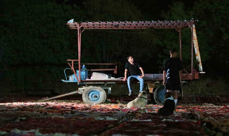 Akşam saatlerinde halıların serili olduğu tarlaya geldiklerini, misafirleri olması durumunda da misafirlerini ve arkadaşlarını burada ağırladıklarını belirten Raziye Topkara ise, “Akşam üzeri geliyoruz. Burada yemeğimizi, çayımızı, kahvemizi yapıyoruz. Nöbet tutup halılarımızı bekliyoruz. Halılarımızı koruyoruz. Hırsız falan olmaz buralarda ama tedbir amacıyla nöbet tutuyoruz. Domuzlar, tilkiler geliyor, köpeklerimizle onları kovuyoruz. Burada müşterilerimizin halıları var. Akşamları misafirlerimiz, arkadaşlarımız buraya geliyor. Vakti böyle geçiriyoruz” ifadelerini kullandı.