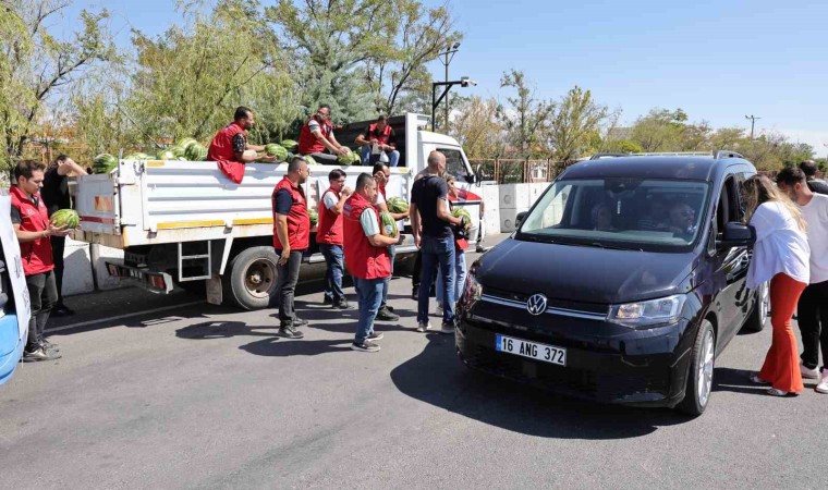 Yapılan çalışma hakkında bilgiler veren Aksaray Belediyesi Halkla İlişkiler Sorumlusu Büşra Seda Bayar, “Belediye başkanımız Evren Dinçer’in talimatıyla Aksaray’ın karpuzunu tanıtmak, çiftçilerimize destek olmak amacıyla şehrimizde üretilen, çiftçilerimizin ürettiği karpuzları aldık ve şehir merkezindeki vatandaşlarımız olmak üzere karayolundan geçiş yapan sürücü ve yolcularımıza karpuz ikram ediyoruz. Bu sayede hem çiftçilerimize destek oluyoruz hem de Aksaray’ımızın güzel karpuzunu tanıtmış oluyoruz. 80 ton karpuz toplandı ve hepsi vatandaşlarımıza ikram edilecek” dedi.