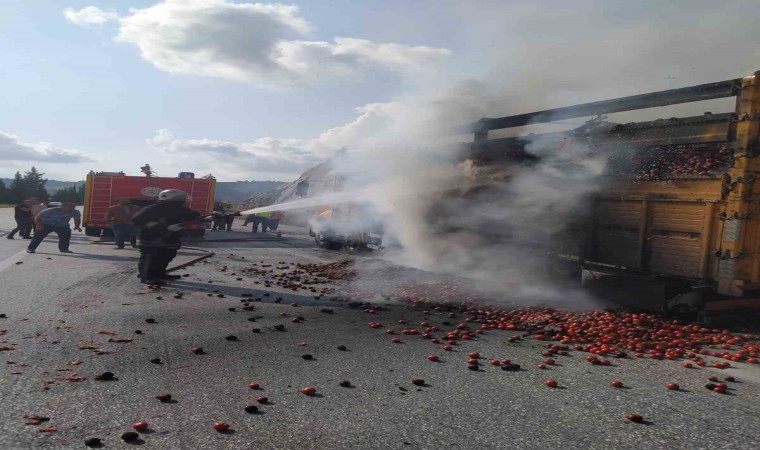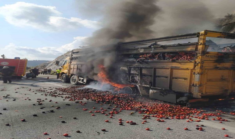 Mersin’in Tarsus ilçesinde domates yüklü kamyon yandı.