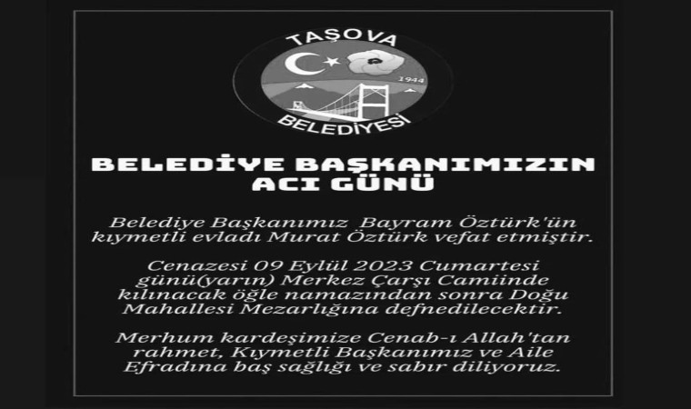 Talha Murat Öztürk’ün (30) vefat haberi sevenlerini yasa boğdu. Başkan Öztürk’ün oğlu Murat Öztürk’ün cenazesinin yarın Taşova Merkez Çarşı Camii’nde kılınacak öğle namazından sonra Doğu Mahallesi Mezarlığı’na defnedileceği öğrenildi.