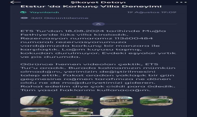 Fethiye’de ailesiyle birlikte güzel bir tatil planı yapan Ali Oktay, internetten beğenip kiraladığı villada karşılaştığı manzara karşısında hayal kırıklığına uğradı. Fotoğraflarda cazip görünen villa, taşan fosseptik çukuru, kirli koltuklar ve yosun tutmuş havuzla gerçek bir kabusa dönüştü. Ailesiyle birlikte bu şartlarda kalamayacağını anlayan Oktay, villayı kiraladığı acente ile iletişime geçti. Firmadan çözüm bulamayan ve büyük mağduriyet yaşayan Oktay, çareyi kendi imkanlarıyla başka yere gitmekte buldu. Oktay’ın, acenteden 69 bin liralık ödemesini geri alabilmesi ise tam 5 gün sürdü ve tatili zehir oldu.