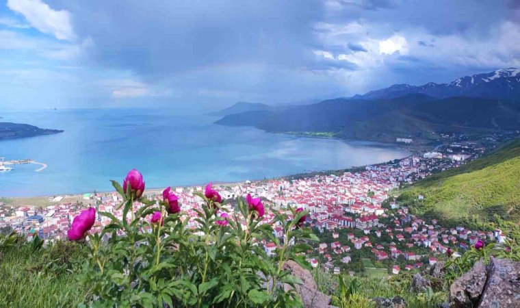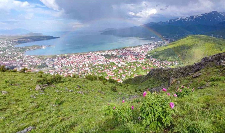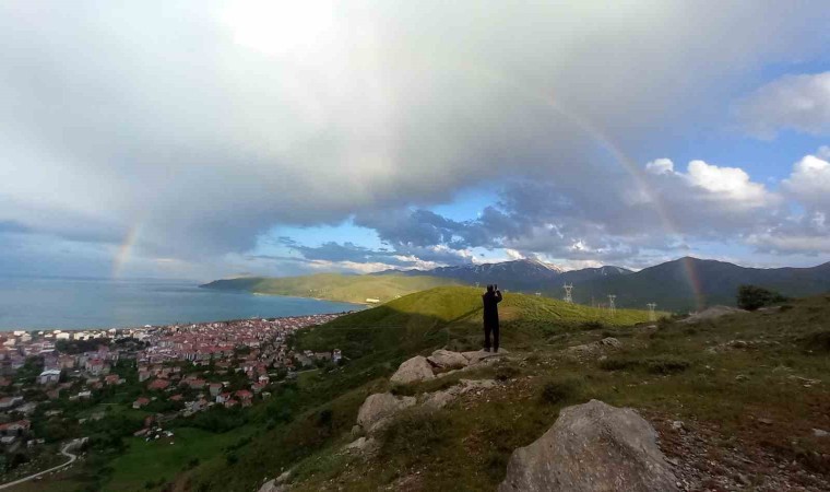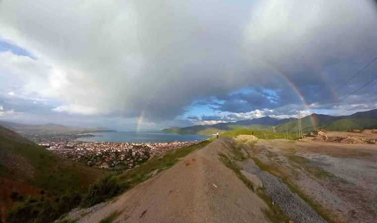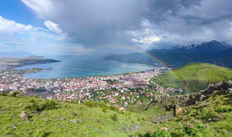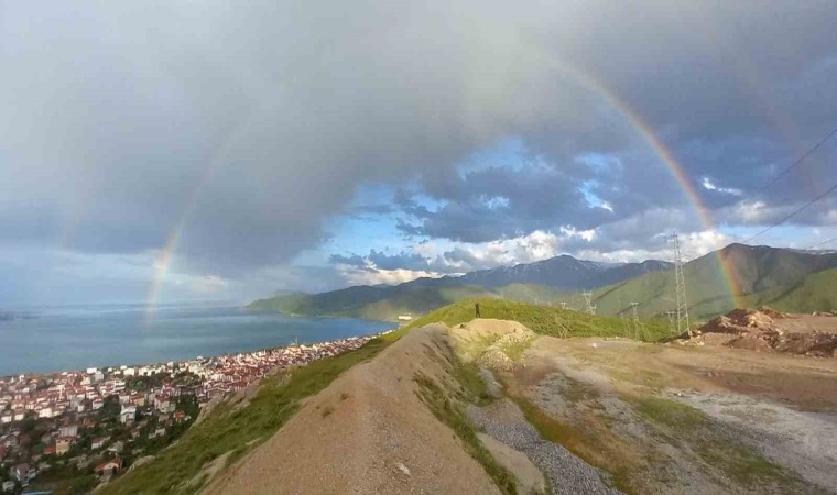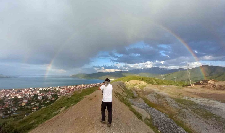 Bitlis’in Tatvan ilçesinde aniden bastıran sağanak yağış sonrasında ilçe merkezi ve Van Gölü üzerinde çıkan gökkuşağının oluşturduğu renk cümbüşü görenleri hayran bıraktı.