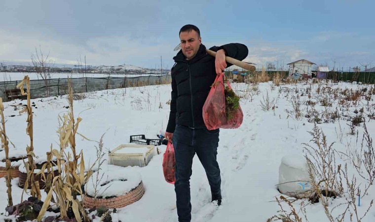Son birkaç gündür yoğun kar yağışının etkisi altında olan Bitlis’te, bir yandan karla mücadele çalışmaları sürerken, diğer yandan ise kar altında kalan ürünlerin hasadı yapılmaya çalışılıyor. Tatvan ilçesinde yaşayan Mehmet Okay isimli vatandaş, bahçesine ektiği havuçların hasadına başladı. Bölgede havuç yetiştiriciliği konusunda örnek bir girişim sergileyen Mehmet Okay, hem yerel tarıma dikkat çekiyor hem de doğanın sunduğu şartlardan en iyi şekilde faydalanmaya çalışıyor. Karla kaplı bahçesine kürek ve çapayla giderek havuçların üzerini temizleyen Okay, karın altındaki havuçları tek tek topladı.