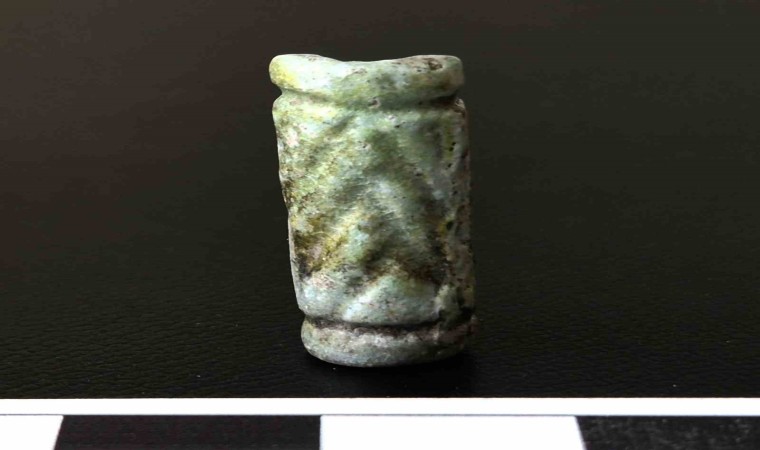 Fayanstan yapılmış bu nadir mühür, üst ve alt hattı çizgilerle sınırlandırılmış, iç kısmında ise iç içe ikili ve üçlü gruplar halinde yerleştirilmiş “V” motifleriyle bezenmiş. Orta Anadolu’da Kültepe ve Acemhöyük gibi büyük ticaret merkezlerinden bilinen fayans silindir mühürlerin, Batı Anadolu’daki ilk örneği olarak kayda geçen bu mühür, doğu ile batı arasında yeni ticaret yollarının varlığını açıkça ortaya koyuyor.