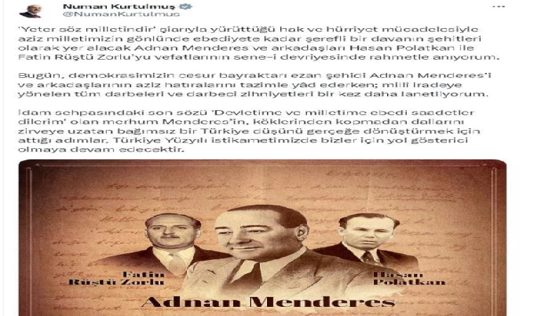 ANKARA, (DHA)- TBMM Başkanı Numan Kurtulmuş, merhum Başbakan Adnan Menderes, Dışişleri Bakanı Fatin Rüştü Zorlu ve Maliye Bakanı Hasan Polatkan'ı idam edilişlerinin 62'nci yılında andı.