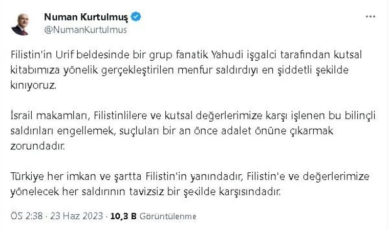 TBMM Başkanı Numan Kurtulmuş, Filistin Urif beldesinde meydana gelen fanatik Yahudi grubunun Kur'an-ı Kerim'e yönelik saldırısını şiddetle kınadı. Kurtulmuş, Twitter üzerinden yaptığı açıklamada, "Filistin'in Urif beldesinde bir grup fanatik Yahudi işgalcilerin kutsal kitabımıza yönelik gerçekleştirdiği menfur saldırıyı en sert şekilde kınıyoruz. İsrail makamları, bu bilinçli saldırıları önlemek ve suçluları hemen adalete teslim etmekle yükümlüdür. Türkiye, Filistin'in yanındadır ve değerlerimize yapılan her türlü saldırıya karşı kararlıdır" ifadelerini kullandı.