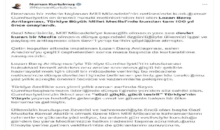 ANKARA, (DHA)- TBMM Başkanı Numan Kurtulmuş, ”Lozan Barış Antlaşması’yla Türkiye Cumhuriyeti’nin uluslararası hukuktaki temeli atılırken onu asırlar sonrasına güçlü bir şekilde hazırlayabilmek için ciddi bir mücadele verilmiş; bu mücadele neticesinde dünya devletleri içinde belirlenen yerimiz geride bıraktığımız yüzyıllık süreçte önemli tecrübe ve kazanımlarla pekişmiştir” dedi.