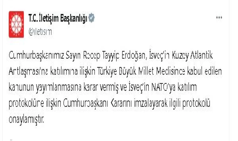 İletişim Başkanlığı'nın sosyal medya hesabından İsveç'in NATO üyeliğine onay verilen kanuna ilişkin yapılan açıklamada, "Cumhurbaşkanımız Sayın Recep Tayyip Erdoğan, İsveç'in Kuzey Atlantik Antlaşması'na katılımına ilişkin Türkiye Büyük Millet Meclisince kabul edilen kanunun yayımlanmasına karar vermiş ve İsveç'in NATO'ya katılım protokolüne ilişkin Cumhurbaşkanı Kararını imzalayarak ilgili protokolü onaylamıştır" denildi. (DHA)