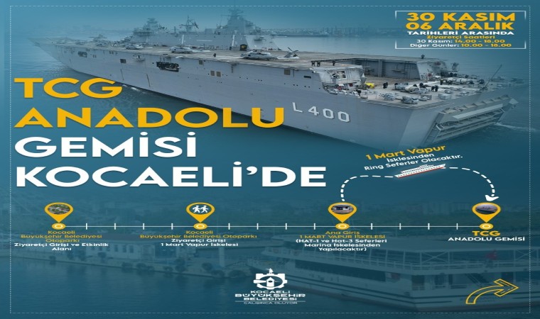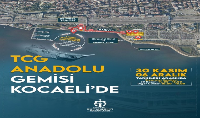 Kocaeli Büyükşehir Belediye Başkanı Tahir Büyükakın’ın Deniz Kuvvetleri Komutanlığı yetkilileriyle yaptığı görüşmeler olumlu sonuçlanmıştı. Cumhuriyetin 100. yılında Türkiye’nin liman kentlerini ziyaret eden TCG Anadolu, İzmit Körfezi’ne de demirleyecek. 30 Kasım günü 14.00-18.00 saatleri arasında, 1-6 Aralık tarihleri arasında da 10.00-18.00 saatleri arasında gemi ziyarete açık kalacak. SİHA, Kızılelma insansız savaş uçağı, Hürjet hafif taarruz helikopterinin iniş-kalkış