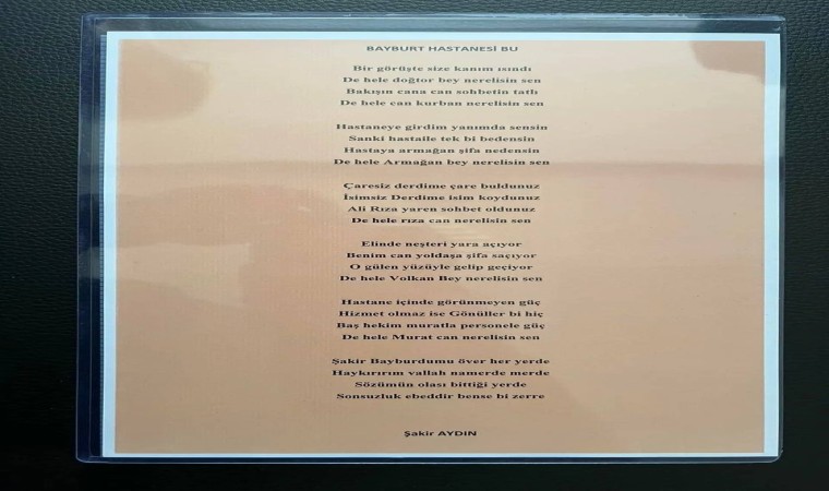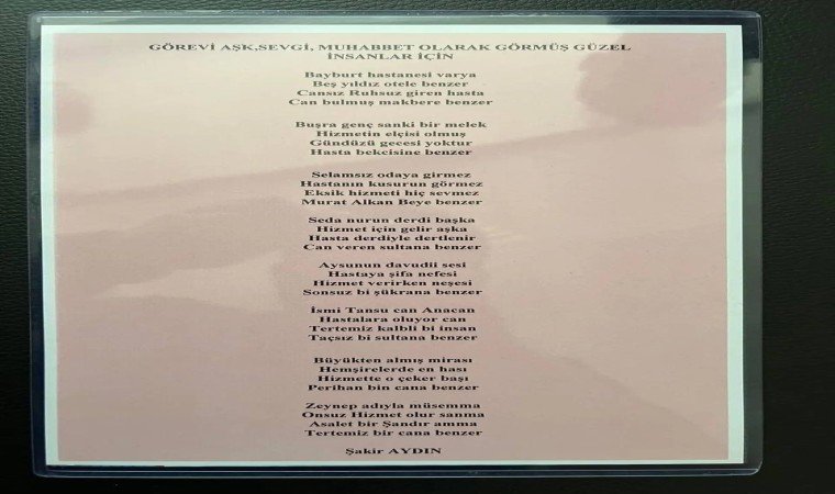 Bayburt’ta Şakir Aydın isimli hasta yakını, tedavi gördükten sonra eski sağlığına kavuşup, taburcu olan eşiyle yakından ilgilenen doktor ve hemşirelere şiirler yazdı. Eşine olan sevgisini, doktorlara olan vefasını şiirler yazarak gösteren Aydın, davranışıyla hem takdir topladı, hem de yürekleri ısıttı.
