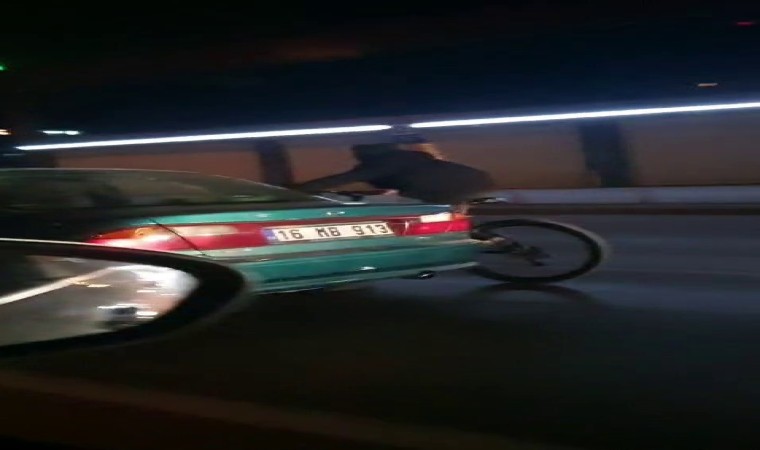 Bursa’da seyir halindeki otomobile tutunarak ilerleyen bisiklet sürücüsü kendisini tehlikeye attı. O anlar saniye saniye kaydedildi.