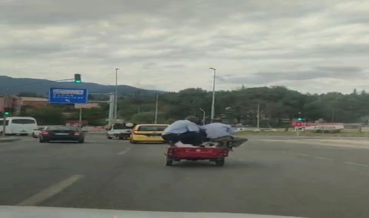 Kardemir istikametinden Demir Çelik Kavşağı’na giriş yapan 3 tekerlekli motosikletin arkasında sağlı sollu oturarak yolculuk yapan 2 kişi görenleri hayrete düşürdü. Düşme tehlikesi bulunan 2 kişiden birinin ise ayaklarının dışarıda olması trafikte tehlike oluşturdu.