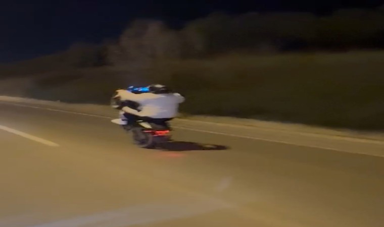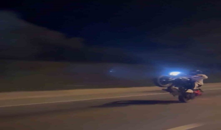 Bursa’da bir motosiklet sürücüsü anayolda ön tekeri kaldırıp, kilometrelerce ilerledi. Sürücünün tehlikeli yolcuğu kameraya saniye saniye yansıdı.