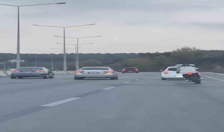 Bursa’da bir motosiklet sürücüsü anayolda ön tekeri kaldırıp kilometrelerce ilerledi. Sürücünün tehlikeli yolcuğu kameraya saniye saniye yansıdı.