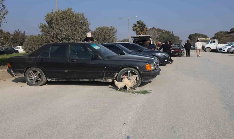 Hatay’da aracını satmak için araba pazarına getiren Mehmet Kuyucu, hobi olarak beslediği tavuğu ve horozunu da aracın tekerine bağlayarak aracıyla birlikte satışa çıkardı. Aracın tekerine bağlı hayvanlar görenlerin dikkatini çekerken Kuyucu, tavuk ile horoza 3 bin TL arabaya ise 260 bin TL’den müşteri bekledi.