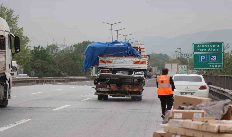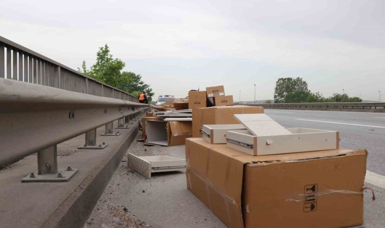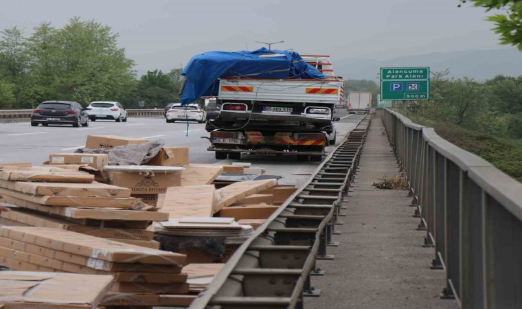 Anadolu Otoyolu Sakarya geçişinde mobilya malzemeleri taşıyan kamyonet, önünde tekeri patlayan tıra ve bariyerlere çarparak durabildi. İki kişinin yaralandığı kazada kamyonette bulunan mobilya malzemeleri ise otoyola savruldu.