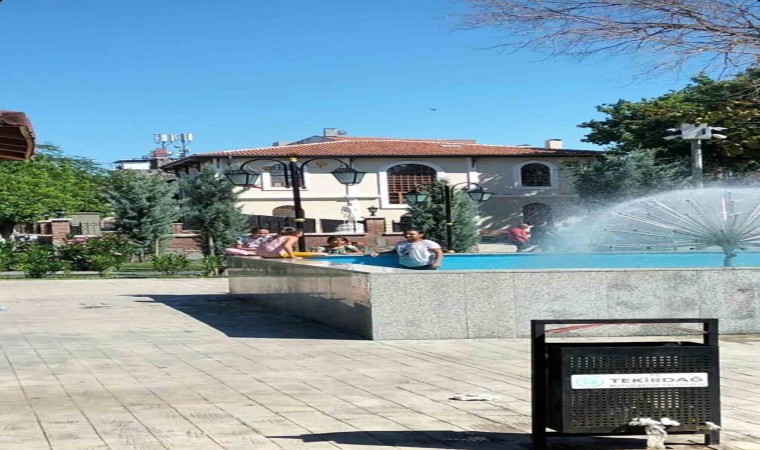 Tekirdağ’ın Muratlı ilçesinde sıcaktan bunalan çocuklar, tehlikeye aldırış etmeden girdikleri süs havuzunda eğlendi.