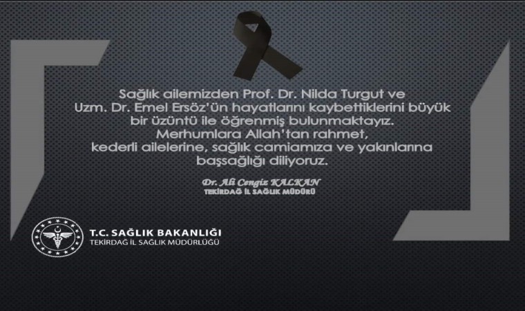 Tekirdağ İl Sağlık Müdürlüğü tarafından yayımlanan taziye mesajında, Prof. Dr. Nilda Turgut ve Uzm. Dr. Emel Ersöz’ün vefatının derin üzüntüyle karşılandığı belirtilerek, "Merhumlara Allah’tan rahmet, kederli ailelerine, sağlık camiamıza ve yakınlarına başsağlığı diliyoruz" denildi.