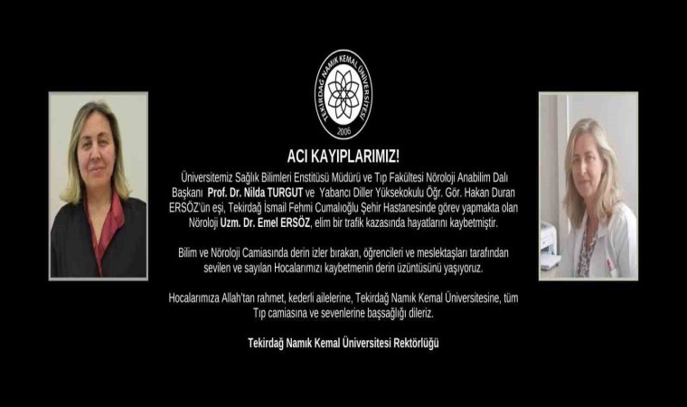 Tekirdağ Namık Kemal Üniversitesi Rektörlüğü de bir taziye mesajı yayımladı. Mesajda, bilim ve nöroloji camiasında derin izler bırakan Prof. Dr. Nilda Turgut ve Uzm. Dr. Emel Ersöz’ün kaybının büyük bir acı olduğu ifade edildi. Üniversite, hocalara Allah’tan rahmet, kederli ailelerine ve tüm sağlık camiasına başsağlığı diledi.