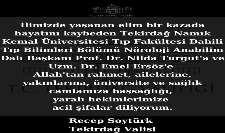 Tekirdağ Valisi Recep Soytürk yaptığı açıklamada, "İlimizde yaşanan elim bir kazada hayatını kaybeden Tekirdağ Namık Kemal Üniversitesi Tıp Fakültesi Dahili Tıp Bilimleri Bölümü Nöroloji Anabilim Dalı Başkanı Prof. Dr. Nilda Turgut’a ve Uzm. Dr. Emel Ersöz’e Allah’tan rahmet, ailelerine, yakınlarına, üniversite ve sağlık camiamıza başsağlığı, yaralı hekimlerimize acil şifalar diliyorum" dedi.