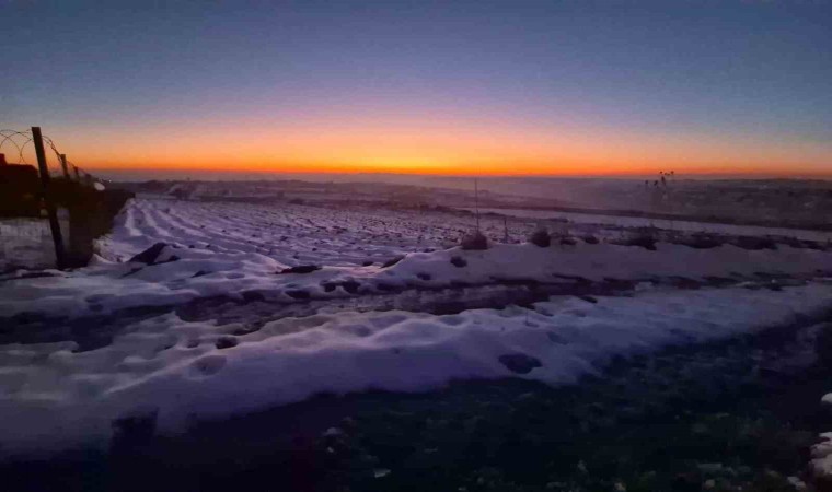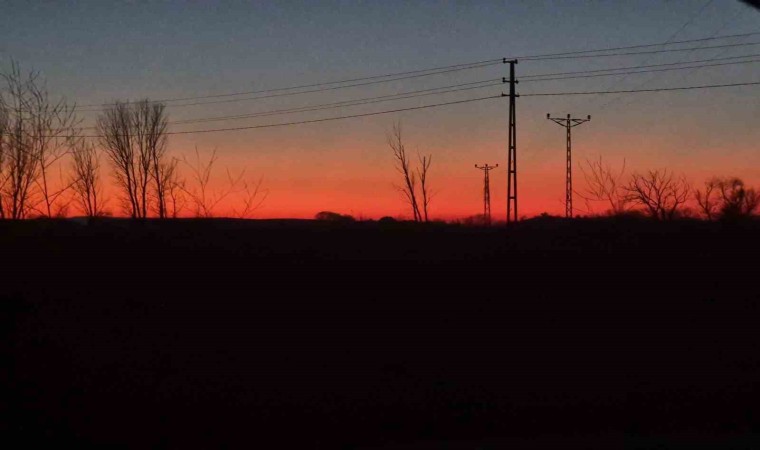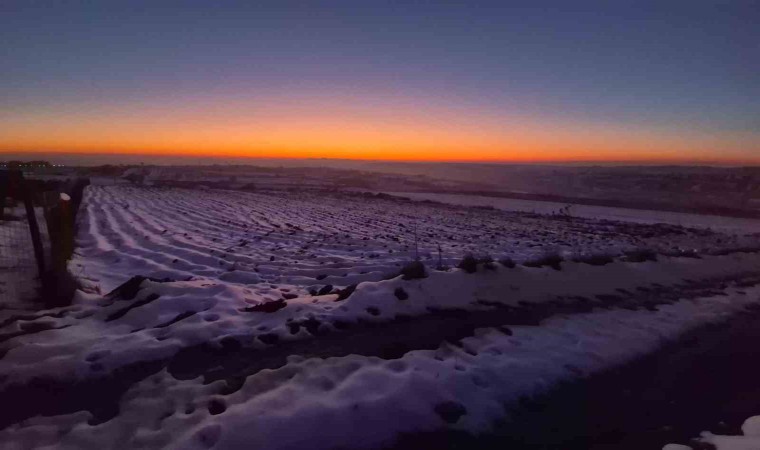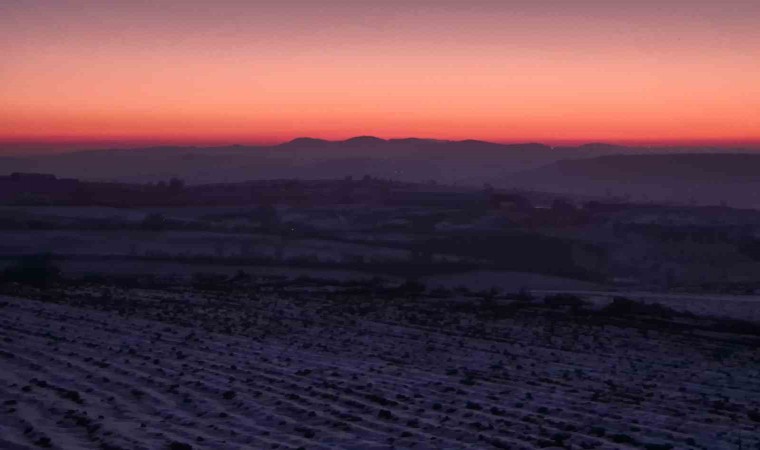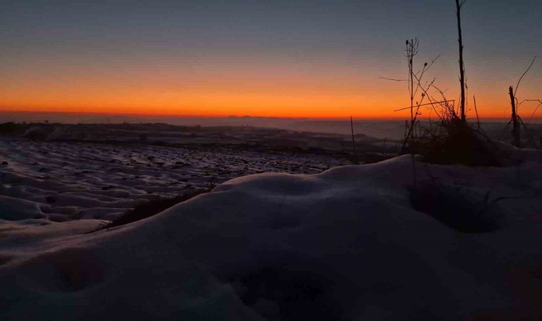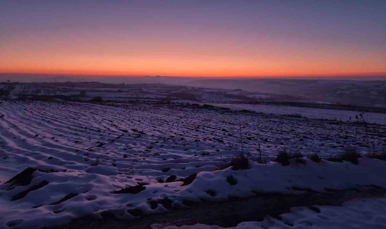 Tekirdağ’ın Malkara ilçesinde güneşin batışıyla birlikte oluşan kızıllık ve karla kaplı doğa, adeta görsel şölen sundu.