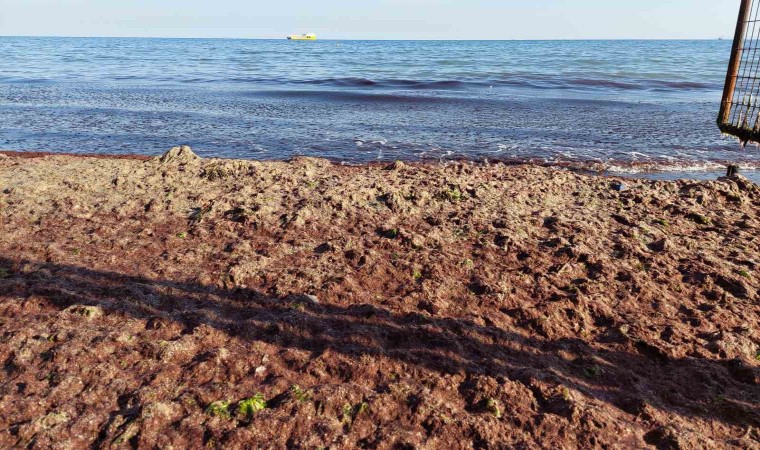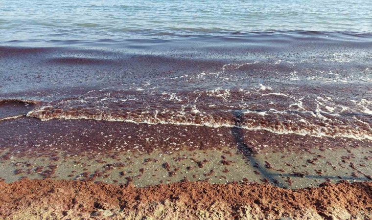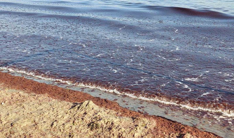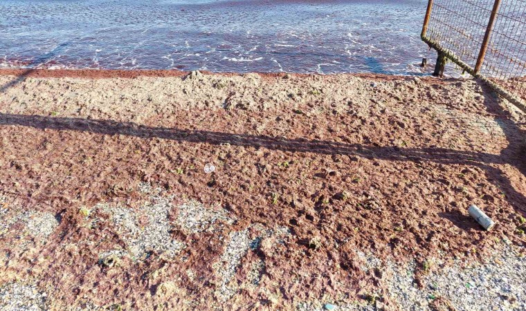 Tekirdağ’ın Süleymanpaşa ilçesi sahilinde, kuvvetli poyrazın etkisiyle kızıl yosunların kıyıya sürüklenmesi sonucunda sahil şeridi kırmızı tonlarda yosunlarla kaplandı.