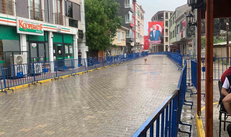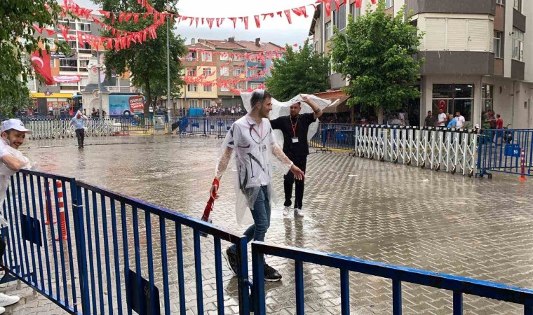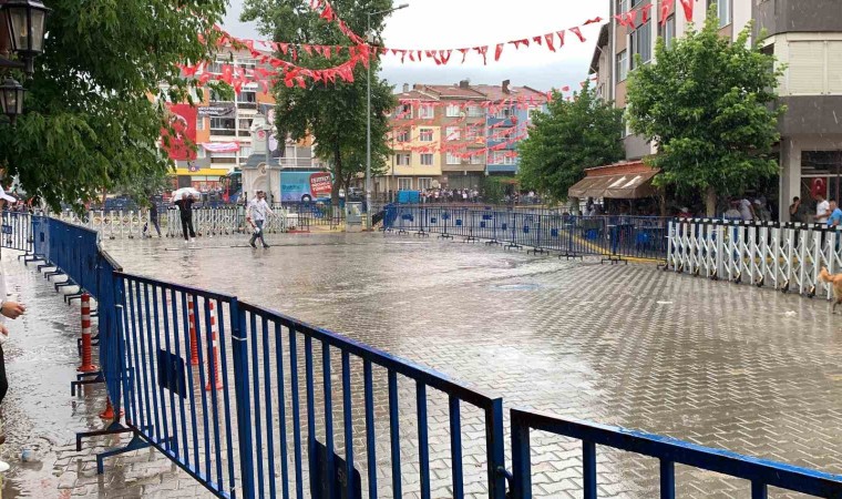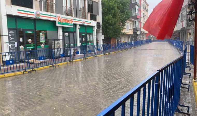 Yağışın Hayrabolu ilçesinde miting yapacak olan CHP Genel Başkanı Özgür Özel’in miting yapacağı saatin öncesine denk gelmesiyle miting alanına girmek için hazırlık yapan vatandaşlar adeta sırılsıklam oldu. Bazı vatandaşlar miting alanında dağıtılan yağmurluklar ile yağmurdan korunmaya çalışırken, bazı vatandaşlar binaların çatılarının altında bekledi.