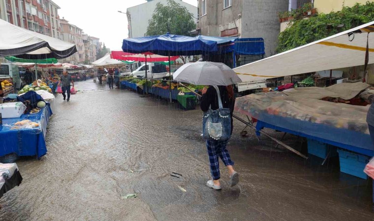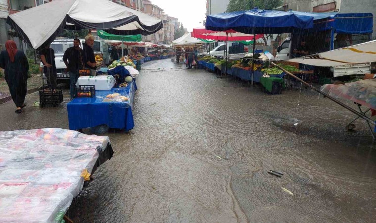 Tekirdağ’da etkili olan şiddetli yağış, Süleymanpaşa’da kurulan Salı Pazarı’nı sular altında bırakarak esnaf ve vatandaşlara zor anlar yaşattı.