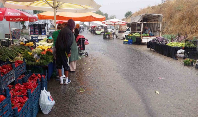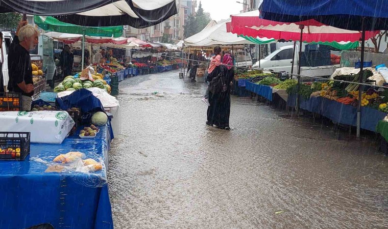 Öğlen saatlerinde başlayan yağmur, kısa sürede şiddetini artırarak caddeyi sular altında bıraktı. Pazar esnafı tezgahlarını korumak için çaba gösterirken, yollar adeta dere gibi aktı. Bölgeye gelen ekipler, su tahliyesi için çalışmalara başladı.