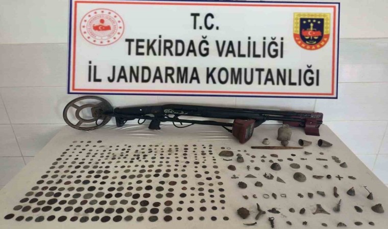 Tekirdağ’ın Kapaklı ilçesi Atatürk Mahallesinde ikamet eden Ç.G isimli şahsın ikamet adresinde ve aracında tarihi eser objelerinin bulunduğu yönünde bilgi alınması üzerine Tekirdağ İl Jandarma Komutanlığı ekiplerince adreste arama yapıldı. Yapılan aramada, 312 sikke, 76 adet tarihi eser objesi, 1 adet dedektör, 1 adet ruhsatsız av tüfeği ele geçirildi. Ayrıca şahsa 2521 SKM suçundan 2 bin 864 TL idari para cezası uygulandı. Şüpheli ifadesi alındıktan sonra serbest bırakıldı.