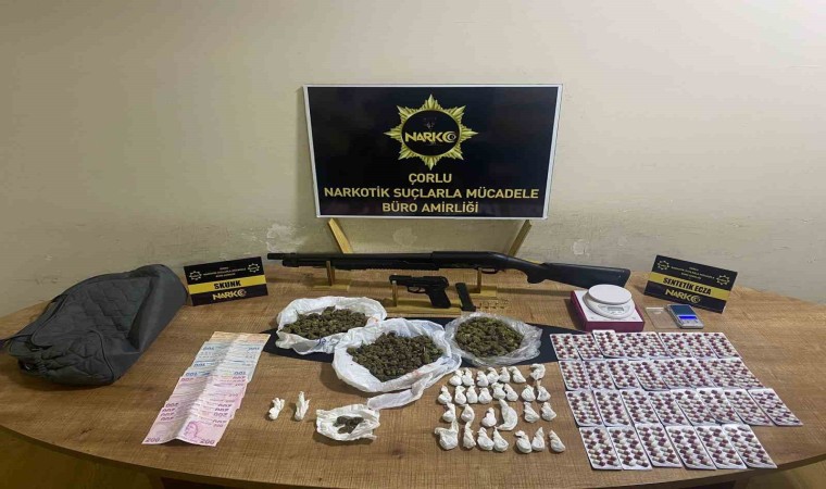 Tekirdağ İl Emniyet Müdürlüğü Narkotik Suçlarla Mücadele Şube Müdürlüğü ekiplerince Süleymanpaşa ilçesinde bir araç ve Çorlu ilçesinde 2 adreste yapılan aramada 1010 sentetik ecza hap, 379 gram skunk maddesi, 4,3 gram metamfetamin maddesi, 0,4 gram Eroin maddesi, 2 adet hassas terazi, 1 adet ruhsatsız tabanca, 1 adet ruhsatsız av tüfeği, 4 adet tabanca fişeği, uyuşturucu madde ticaretinden elde edildiği değerlendirilen 6 bin 900 TL nakit para ele geçirildi.