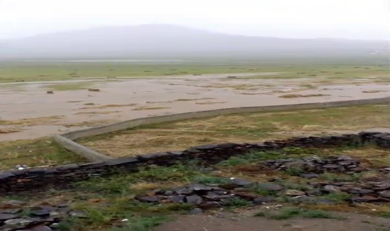 Erzurum’un Tekman ilçesinde yüzlerce ot balyası sel sularına gömüldü.