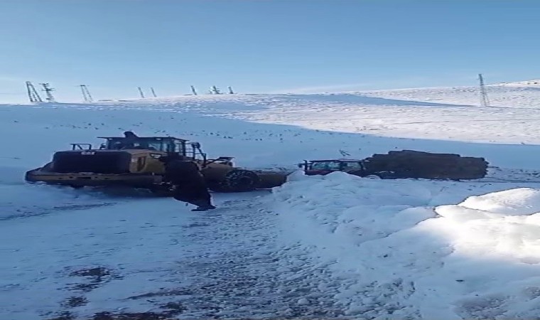 Erzurum’un Tekman ilçesinde ot yüklü traktör mezra yolunda kalınca iş makinası yardımıyla ahıra çıkarıldı.