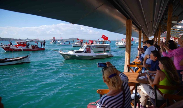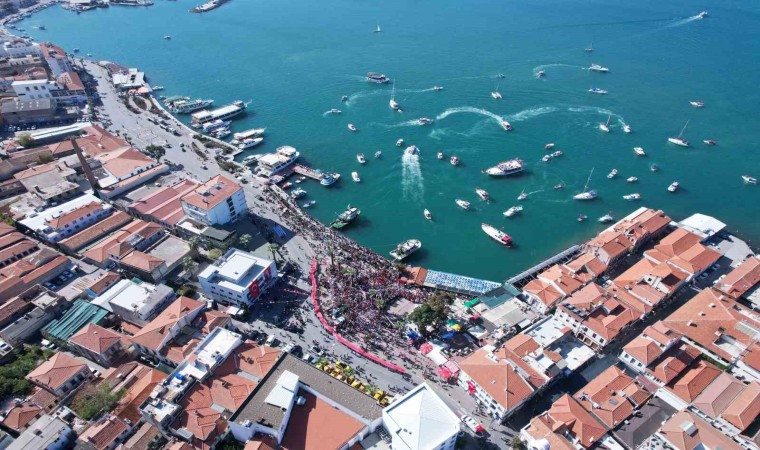 Balıkesir’in Ayvalık ilçesinde karada on binlerce kişi Cumhuriyet için yürürken, denizde oluşturulan tekne korteji de büyük ilgi gördü.