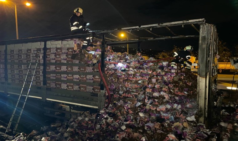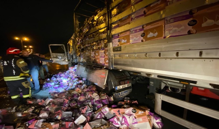 Kütahya’dan İstanbul’a seyir halinde olan tırda çıkan yangının elektrik tesisatından kaynaklı meydana geldiği öğrenildi. Olay sebebiyle iç çamaşırların birçoğu yandı.