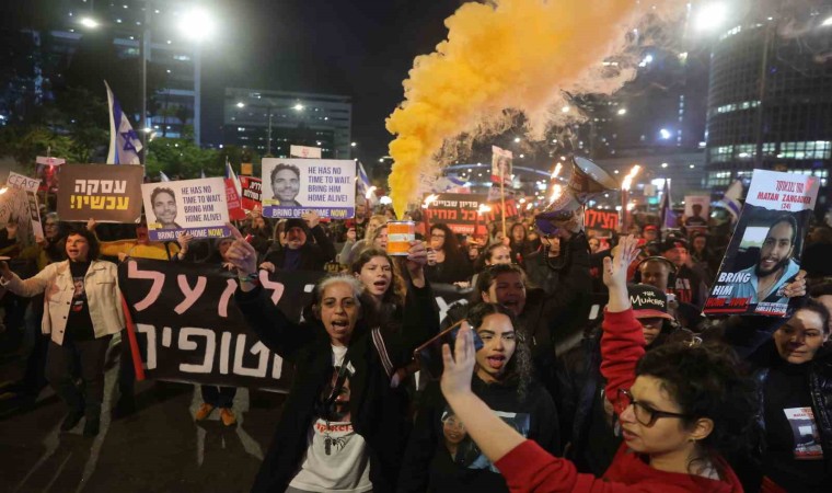 İsrail Başbakanı Binyamin Netanyahu aleyhtarları başkent Tel Aviv’de bir kez daha sokaklara döküldü. Netanyahu hükümetinin savaş politikasını protesto eden göstericiler Savunma Bakanlığı önünde bir araya geldi. Esirlerin serbest bırakılması için yeni bir anlaşma yapılması ve erken seçim çağrısında bulunan eylemciler, hükümet aleyhinde sloganlar atarak hükümetin istifasını istedi. Tel Aviv’in Kaplan Caddesi’ne doğru yürüyüşe geçen göstericilerin yola barikat kurmak istemesinin ardından polis, göstericileri tazyikli su ve atlı birliklerle durdurmak istedi. Polis ile göstericiler arasında arbede yaşanırken bir İsrail polisi göstericiyi copla müdahale etti. Göstericiler ile polis arasında yaşanan arbede sırasında yaralananların olduğu öğrenilirken 21 kişi de gözaltına alındı.