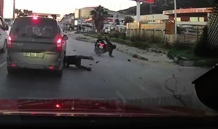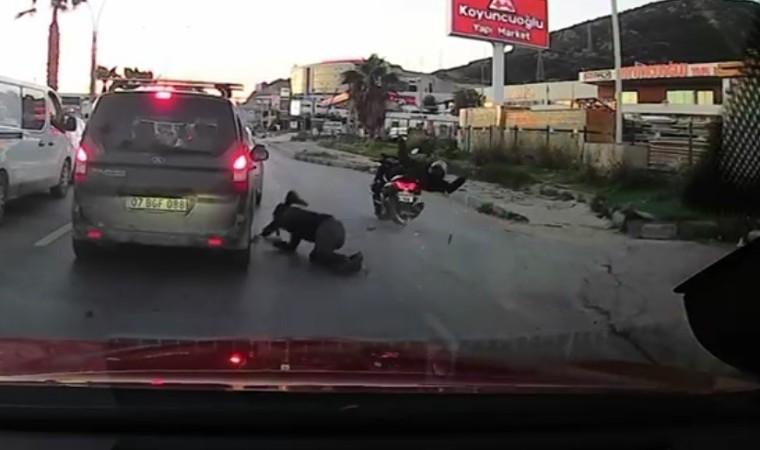 Kaza anı, o esnada ışıkta bekleyen bir aracın kamerasına saniye saniye yansıdı. Görüntüde motosikletin yayaya çarpması, sürücünün ve yayanın yere düşmesi yer alıyor.