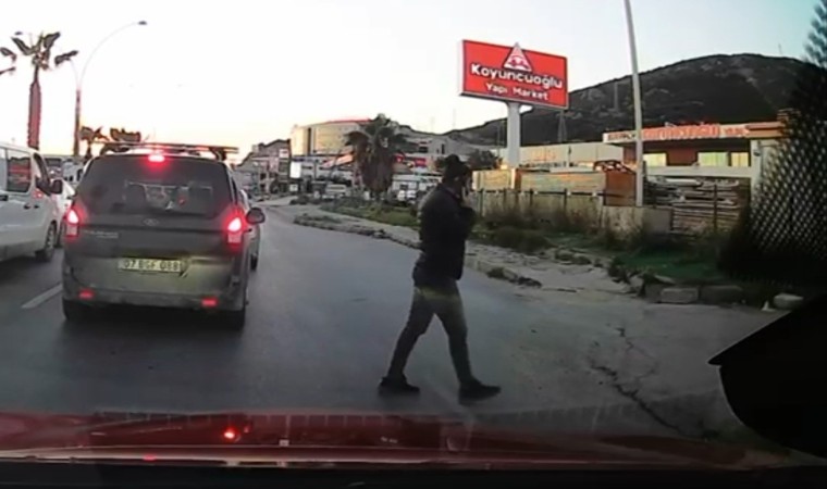 Muğla’nın Bodrum ilçesinde telefonla konuşarak araçların arasından geçmeye çalışan yayaya motosikletin çarpması sonucu meydana gelen trafik kazasında 2 kişi yaralandı. Kaza anı, trafikteki bir aracın kamerasına yansıdı.