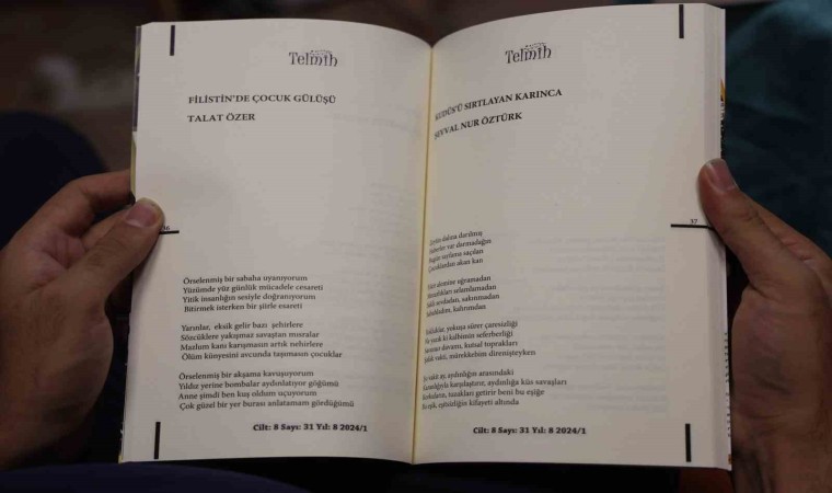 Neşrettikleri derginin son sayısında savaşa dur demek için yazdıklarını dile getiren Talat Özer, ’’İnsanlık adına kültür, sanat ve edebiyat adına çalışmalar sürdürüyorum. Bu çalışmalarımız ile birlikte insanlığa ses olmayı amaçlıyoruz. Telmih dergimizin 31. sayısı ise Filistin armağanı olarak çıktı. Şairlerimiz, yazarlarımız ve sanatçılarımız ile birlikte mısraların dili ve kelimelerin özü ile savaşa dur demek istedik. Bugün itibariyle 300 günü aşan bir savaş serüveni var. Çocuklar ölüyor. Annelerin gözlerindeki yaş artık kurumaya başladı. Bu savaşı durdurabilmek ve barışın gelebilmesi için bizler kalemimizi elimize almak istedik. Bu bir toplumun davası değil, dünyanın bir mücadelesi. Dünya artık bu savaşın bitmesini istiyor. Kültürel olarak da bizler şiirlerimiz ve yazılarımız ile düşünsel olarak dünyaya seslenmek istiyoruz’’ dedi.