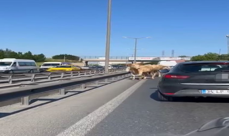 Sahibinden kaçan inekler Esenyurt’ta TEM Otoyolu’na girdi. Yolun ortasında araçlara aldırış etmeden ilerleyen büyükbaş hayvanlar, aniden sürücülerin önüne çıktı. Yolun ortasında duran inekler sebebiyle bazı araçlar ilerleyemedi. Kimi sürücüler dakikalarca hayvanların çekilmesini beklerken, kimisi ise korna çalarak inekleri yoldan çıkarmaya çalıştı. Polis ekipleri inekleri yakalamak için çalışma başlattı. İlginç anlar ise cep telefonu tarafından görüntülendi.